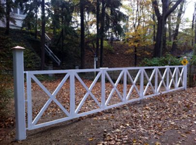 Our company designed and built a set of steel entrance gates (first image below). The owner wanted to keep people from parking on their property. Since the opening was over 30 feet, we constructed the gates with a steel frame and added a cedar facade to warm them up a bit. Each half of the gate also hinges in the middle, so the owner can open and close them even when there are cars parked in the driveway. They are “stand alone” and fully adjustable. The “X” pattern was designed to resemble a Michigan wine rack. We have designed and built two other sets of stand alone gates like these, but with different patterns, and have plans for more.